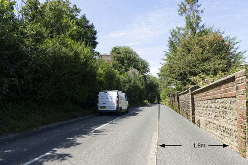 How the Pidddinghoe “pinch point” currently looks and how it could be improved for users with a 1.8m pavement