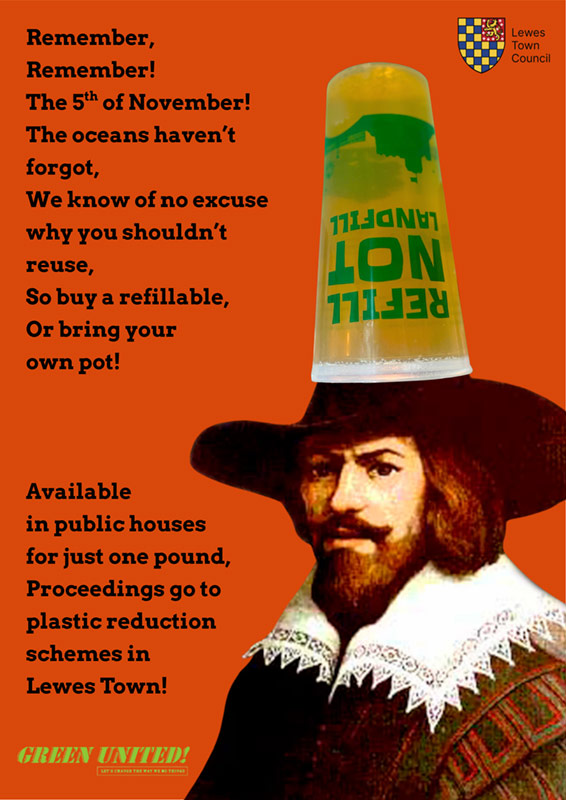 All but a couple of the pubs now use the ‘Lewes Cup’ on Bonfire. All of them will refill the cups or any other reusable cup that punters bring in (provided cups have a legal mark – so no yards of ale please), with the overall result that the town is no longer swimming in cheap plastic by 11pm, and around 80,000 single-use plastic cups are saved from going in the bin every year.